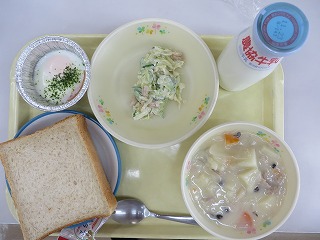 胚芽食パン きのこシチュー カップエッグ ビーンズサラダ ジャム 牛乳