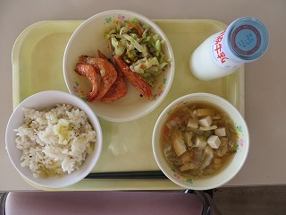 さつまいもごはん あまえびの唐揚げ おひたし けんちん汁 牛乳