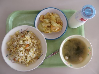 さばチャーハン みそ汁 さつまいもチップス 牛乳