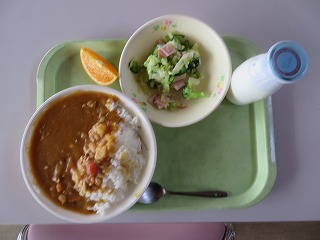 大豆入りカレーライス サラダ オレンジ 牛乳