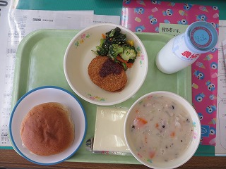 胚芽パン コロッケ トマトシチュー サラダ チーズ 牛乳