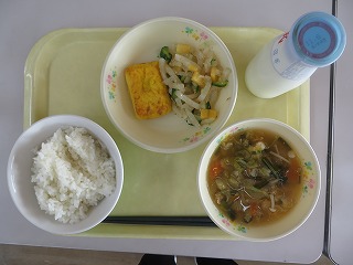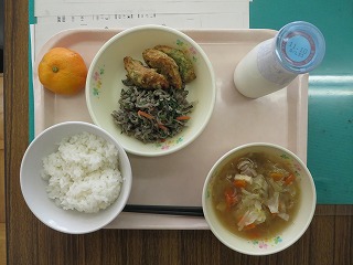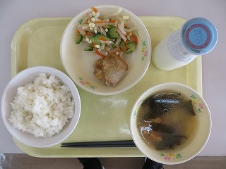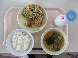 ごはん 鶏肉のカレー揚げ 千草あえ みそ汁 牛乳