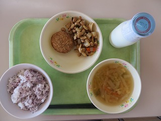 ゆかりごはん きゃべつメンチ 大豆の五目煮 みそ汁 牛乳
