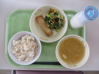 鮭ごはん みそ汁 揚げ春巻き おひたし 牛乳