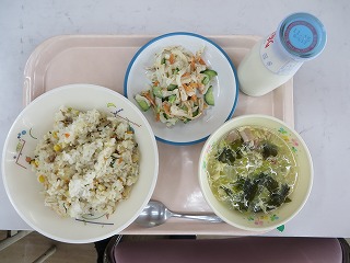牛肉チャーハン 中華スープ イカくんサラダ 牛乳