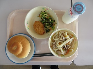 2016年11月15日 11時44分ミルクロール うどん エビカツ おひたし 牛乳