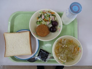 食パン メンチカツ サラダ コンソメスープ 巨峰 チョコレートスプレッド 牛乳