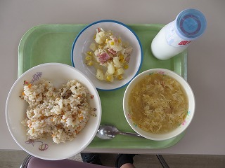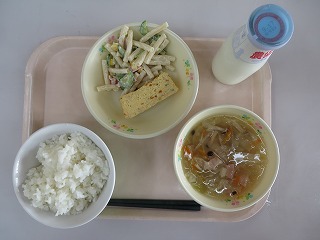 ごはん 五目厚焼き卵 マカロニサラダ 豆のスープ 牛乳