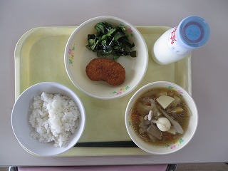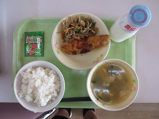 ごはん 豆フライ しらすあえ すいとん風煮 牛乳