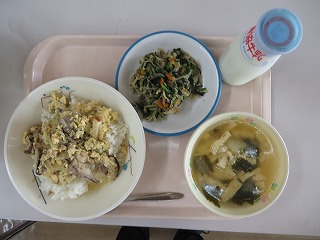 他人丼 いそあえ みそ汁 牛乳