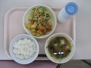 ごはん 鶏肉とじゃがいもの揚げ煮 サラダ みそ汁 牛乳