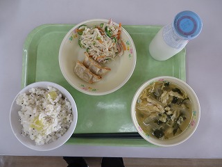 さつまいもごはん ぎょうざ 切り乾し大根のサラダ みそ汁 牛乳
