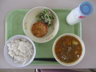 ごはん とうふハンバーグ ゆかりあえ カレースープ煮 牛乳