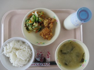 ごはん チキンカツ サラダ みそ汁 牛乳