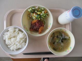 ごはん チキン南蛮 野菜の昆布漬け みそ汁 佃煮 牛乳