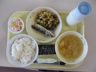 ごはん トビウオの竜田揚げ 切り干しのぴり辛炒め みそ汁 のり かぼすゼリー 牛乳