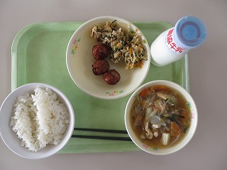 ごはん ミートボールのケチャップ煮 切り干し大根のピリ辛 ちゃんこ風みそ汁 牛乳