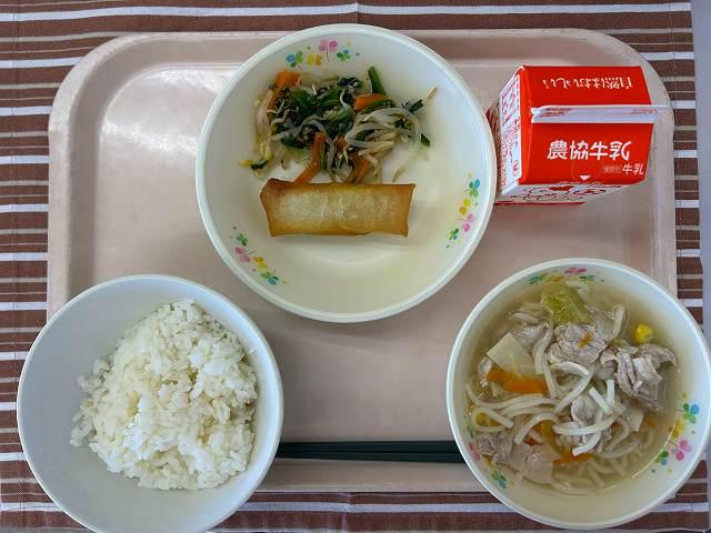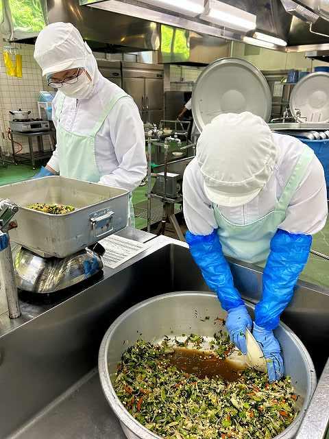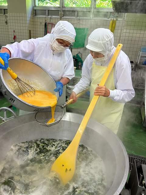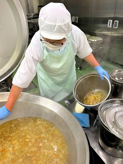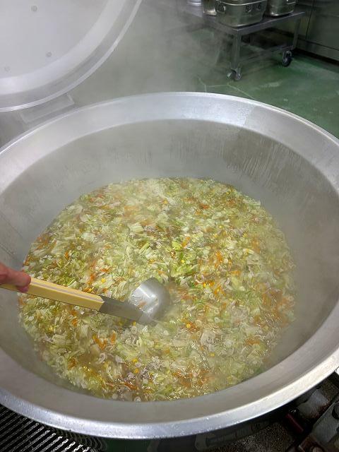 今日は初メニューの「塩ラーメン」です。石川県で有名なラーメン屋さんの塩ラーメンをイメージして野菜たっぷりにしました。麺を入れた時にちょうどいい味になるように、スープの味を少し濃いめに仕上げてあります。子どもたちからは、「おいしい!」「お皿いっぱいに食べたい!」というれしい感想を聞くことができました