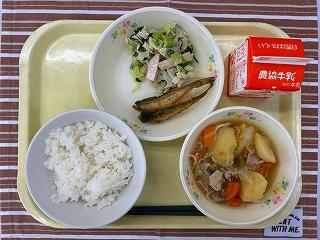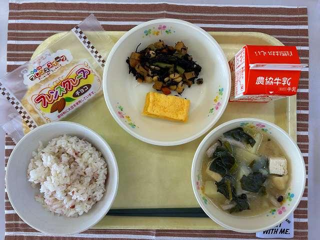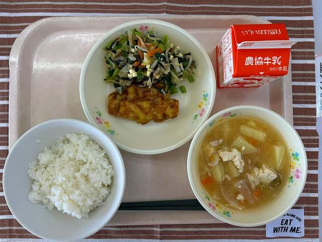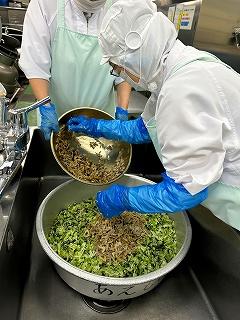あえものには、いつものひじきの佃煮ではなく、しそ味の佃煮を使用しました。カルシウムもとれるようにチーズもプラスしました。食缶のふたをあけた瞬間、うめみたいな匂いする!とすぐに子どもたちは気付いてくれました