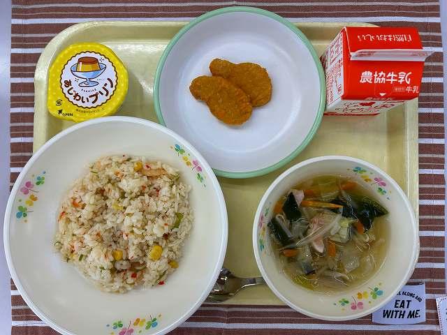 今日は、久しぶりの「えびピラフ」です。ピーマンや赤パプリカ、コーンで彩りよく仕上がりました。