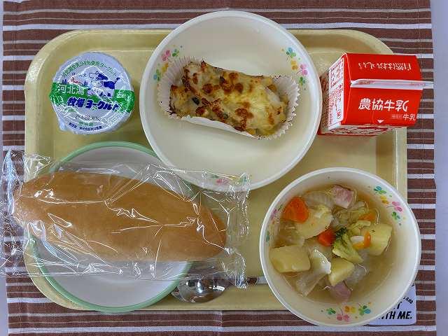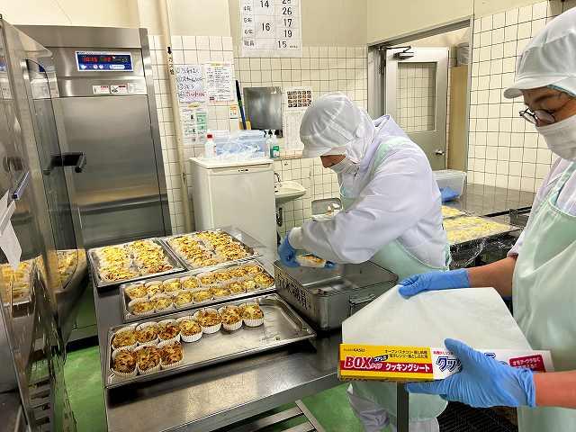 今日はパンの日です。主菜はマカロニグラタンです。たまねぎ、鶏肉、しめじを炒め、豆乳と米粉でルウを作りました。1つ1つカップに入れ、チーズをかけてオーブンで焼きます。手間がかかりますが。手作りはやっぱりおいしいですね!調理場の中はチーズのいい香りが漂っていました。