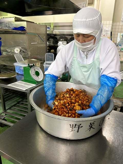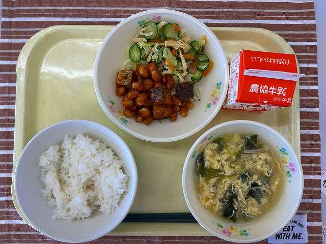 今日の主菜は、「ふくらぎと大豆のケチャップがらめ」です。角切りのふくらぎと水戻しした大豆を揚げ、にんにくやしょうが、ケチャップなどを合わせたタレをからめます。ごはんに合う味つけです。
