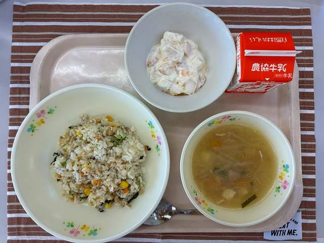 今日は久しぶりの「フルーツヨーグルト」です。ももやパイン、みかんとナタデココをヨーグルトとホイップクリームで和えました。暑い日になったので、冷たいデザートがおいしいですね。