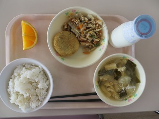 ごはん 菜の花のコロッケ 五目きんぴら みそ汁 オレンジ 牛乳