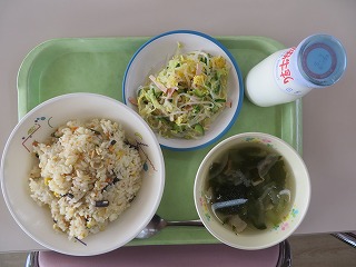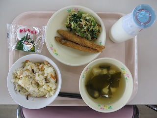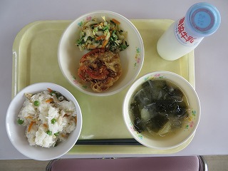 炊き込みご飯 甘エビのかき揚げ ごまあえ みそ汁 牛乳