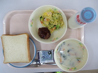 食パン ハンバーグ ミモザサラダ 豆のスープ ジャム 牛乳