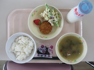 ごはん ハムカツ コロコロサラダ いちご みそ汁 いちご 牛乳