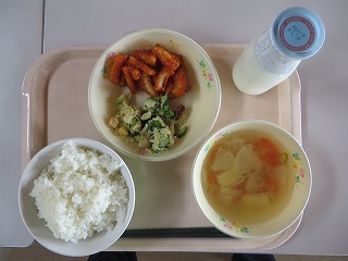 ごはん イカチリ ビーンズサラダ みそ汁 牛乳