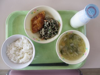 ごはん たらの甘辛 切り干し大根のごまあえ みそ汁 牛乳