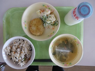 ひじきご飯 とうふハンバーグ ポテトサラダ みそ汁 牛乳