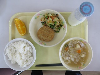 ご飯 あじのメンチカツ おかかあえ 鶏肉の具だくさん汁 オレンジ 牛乳