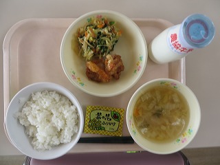 シーチキンチャーハン コンソメスープ ごぼうサラダ 牛乳