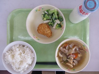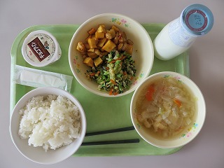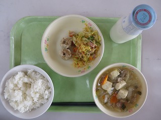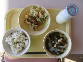 わかめご飯 ちくわの磯辺揚げ 野菜炒め 具だくさんみそ汁 牛乳
