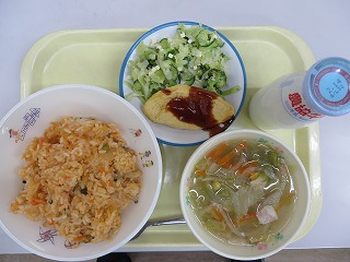 チキンライス オムレツ サラダ コンソメスープ 牛乳