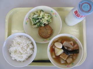ごはん イカメンチカツ ビーンズサラダ おでん 牛乳