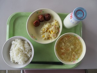 ごはん ミートボールのケチャップ煮 ジャーマンポテト コンソメスープ 牛乳