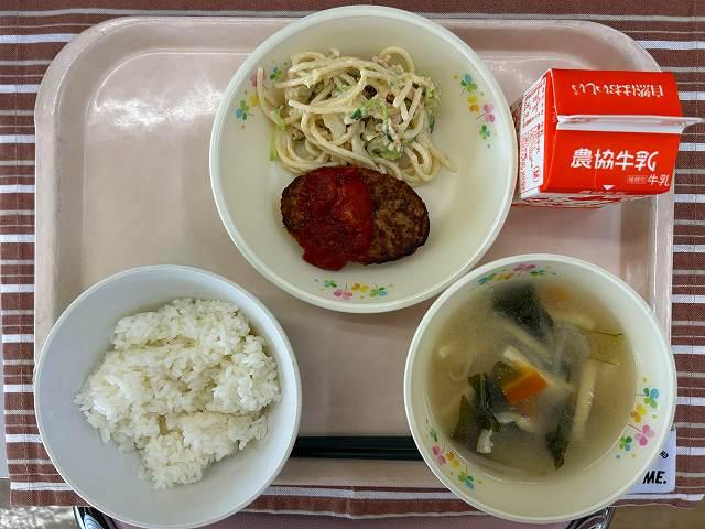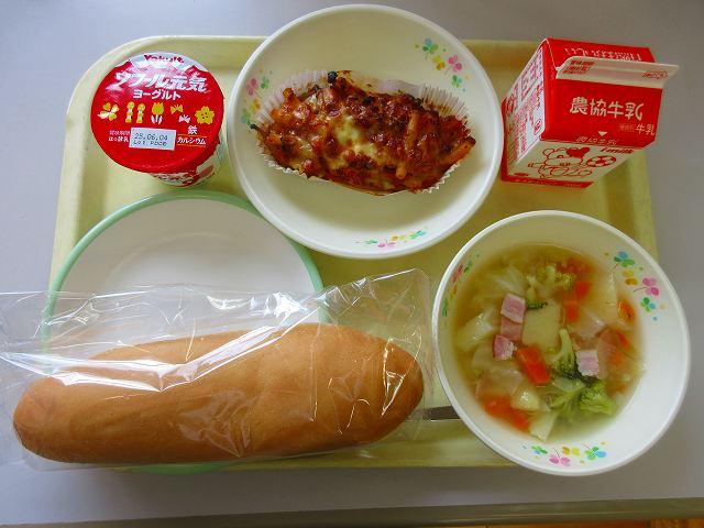 今日は月に2回のパンの日です。主菜は「マカロニのミートソース焼き」です。牛ひき肉、豚ひき肉、野菜をいため、ミートソースを作ります。茹でたマカロニを加えて、1人分ずつカップに入れチーズをかけてオーブンで焼きました。手間のかかる作業ですが、手作りはやっぱりおいしいですね(^▽^)