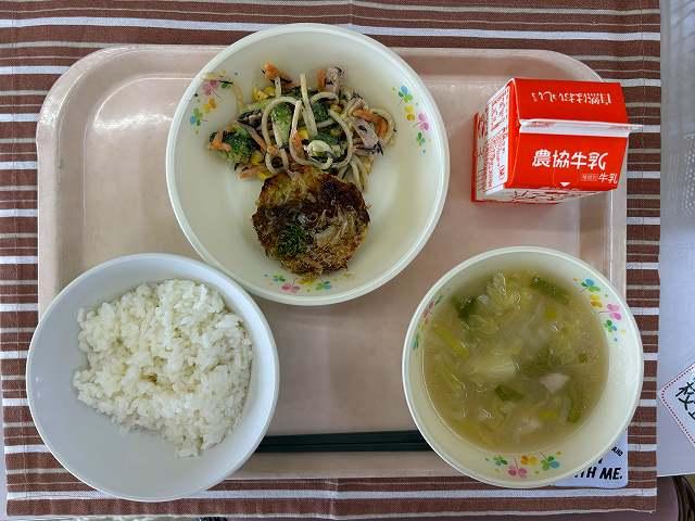 今日はハタハタのから揚げです。骨ごと食べることができるので、カルシウムがたっぷりとれます。給食では石川県産のハタハタを使用しています。今日は、たまごや豚肉なども石川県産です。