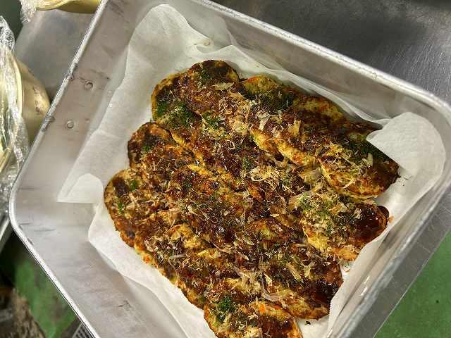 今日の主菜は、「豆腐バーグのお好み焼き風」です。魚のすり身やキャベツなどが入った豆腐バーグを揚げ焼きにし、ソース・かつお節・青のりをかけてお好み焼き風に仕上げました。ソースの香りが食欲をそそります。
