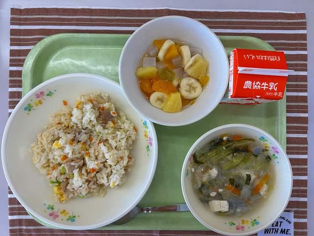 今日の給食は、中華料理です。チャーハンには、たまねぎ・にんじん・焼き豚・炒り卵・えだまめが入っています。彩りよく仕上がりました。