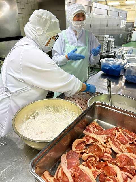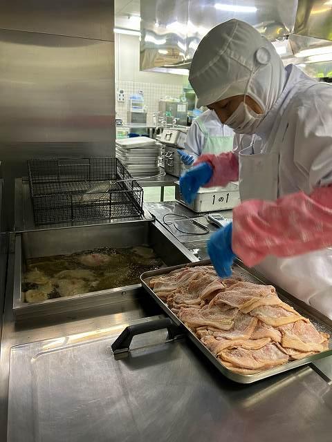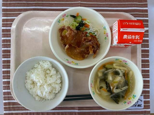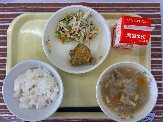 今日、6月4日~10日は「歯と口の健康週間」です。今日はそれにちなんで、「かみかみメニュー」を提供しました。鶏肉の青のり風味揚げは、鶏のむね肉を使用しています。むね肉は、もも肉に比べ脂が少なく、よく噛む食材になります。和え物には、さきいかや切干大根を使いました。みそ汁にも、だいこん・ごぼう・にんじんの根菜類や、しめじが入っています。