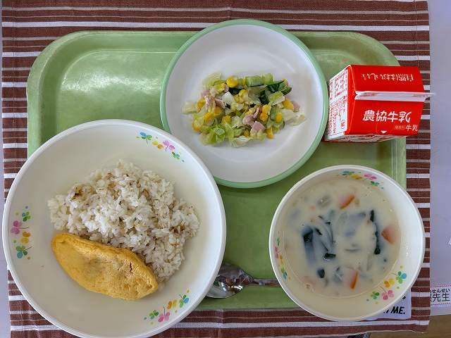 今日は、ごはんの日ですが、洋風のメニューです。洋風なおかずに合うようにコンソメライスを炊いてもらいました。サラダは、「コールスローサラダ」です。キャベツ、きゅうり、コーン、ハムが入っています。ノンエッグドレッシングをベースに酢や塩、こしょうで味を整えました。給食のサラダは、すべて加熱調理します。しっかり温度を上げ、水気を切っています。