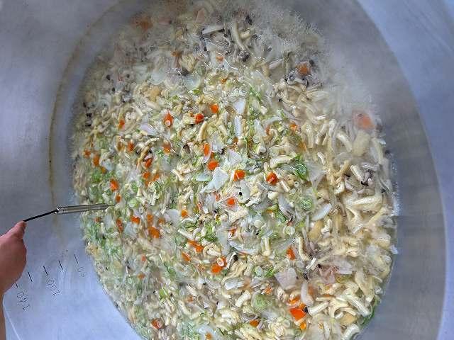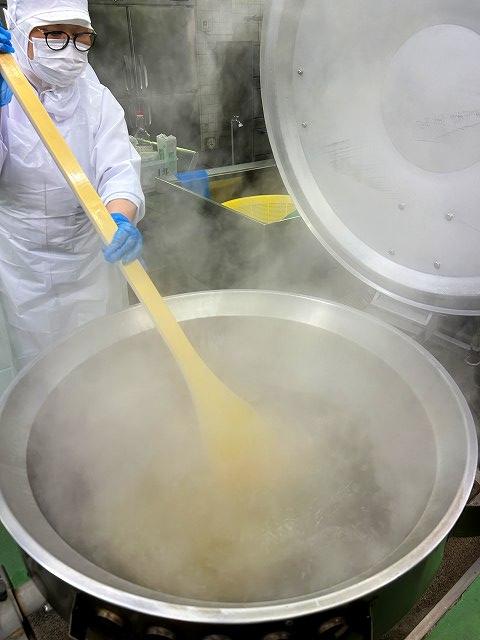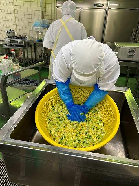 今日の副菜は、「スパゲッティサラダ」です。パスタは、別の釜で茹でて冷やし和えます。くっつかないようにしっかり混ぜています。気温が高くなり、暑いですが、がんばって作業してくれています。