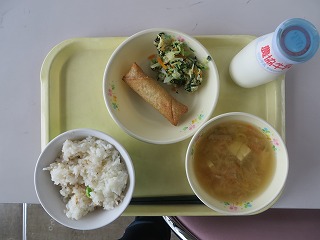 鮭ごはん みそ汁 揚げ春巻き おひたし 牛乳
