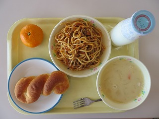 米粉パン ミートソーススパゲティ コンソメスープ みかん 牛乳