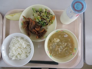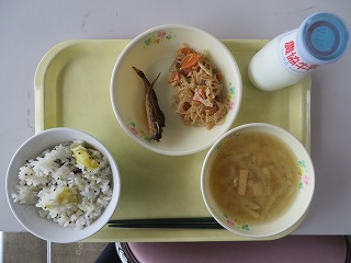 さつまいもご飯 はたはたの唐揚げ れんこんのきんぴら みそ汁 牛乳